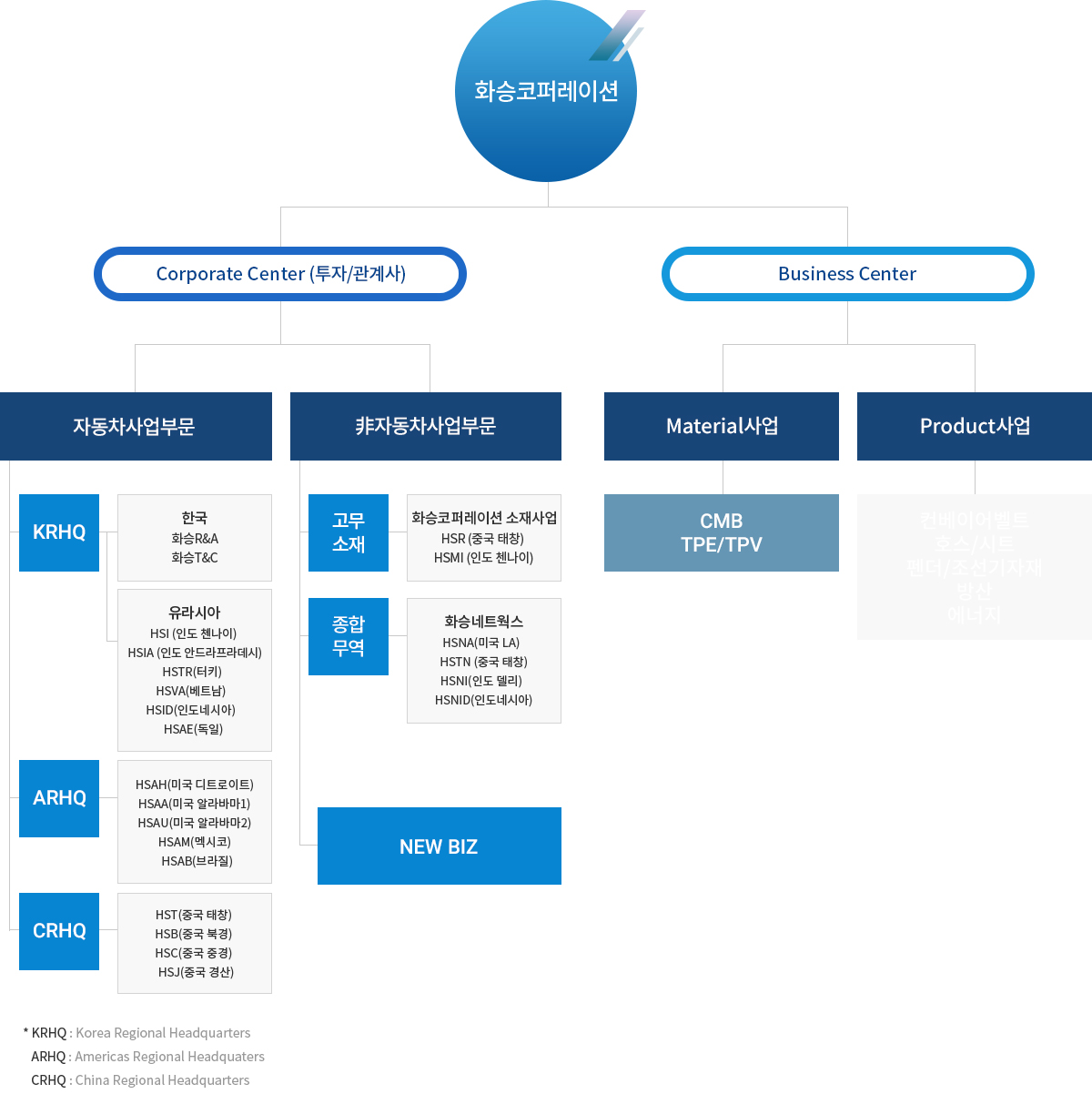 화승코퍼레이션은 전세계 자동차부품, 소재, 종합무역 사업분야의 계열사를 연결하는 GHQ(Global Headquarters)로서 성장의 핵심적인 역할을 하고 있습니다. 자동차부품사업 분야는 지역별 특성을 고려해 *KRHQ, ARHQ, CRHQ로 나누어 원가 관리, 생산 프로세스 개선, 기술 관리 개발 등 다양한 맞춤형 사업 전략을 제공하고 있으며 소재와 종합무역 사업분야에서도 안정적 운영 및 성장 관리를 통해 글로벌 시장의 니즈를 충족하고 있습니다. 계열사의 안정적 관리와 투자를 통해 얻은 수익은 뉴비즈니스 발굴로 이어지는 등 주주를 비롯한 모든 이해관계자가 만족할 수 있도록 성과를 만들어 가겠습니다.