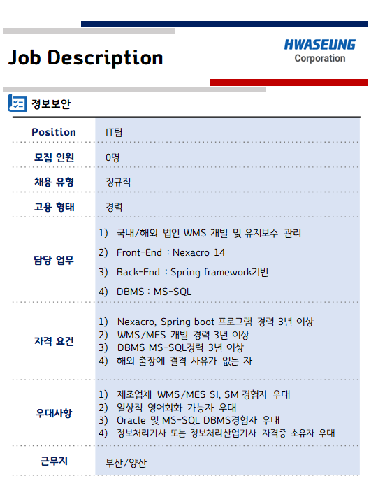 인재채용 채용공고 결과확인 [화승코퍼레이션] IT(정보보안) 경력직 채용 채용회사 화승코퍼레이션 채용대상 경력 직무 IT(ERP,WMS) 채용기간 2024-03-13 ~ 2024-03-18 목록