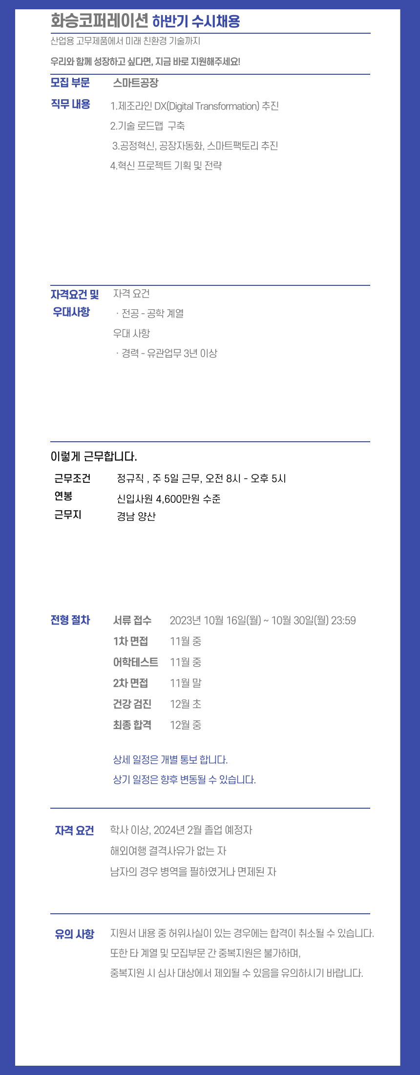 인재채용 채용공고 결과확인 [화승코퍼레이션] 스마트공장 신입/경력직 채용(기간 연장) 채용회사 화승코퍼레이션 채용대상 신입,경력 직무 인도네시아법인 - 품질관리 채용기간 2023-10-16 ~ 2023-11-03 목록