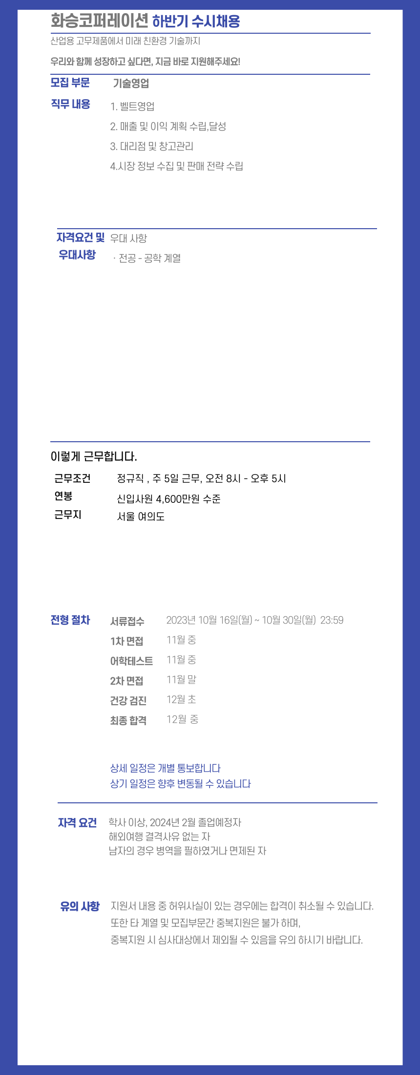 인재채용 채용공고 결과확인 [화승코퍼레이션] 기술영업(서울) 경력직 채용(기간 연장) 채용회사 화승코퍼레이션 채용대상 경력 직무 베트남법인 - 제품개발 채용기간 2023-10-16 ~ 2023-11-03 목록