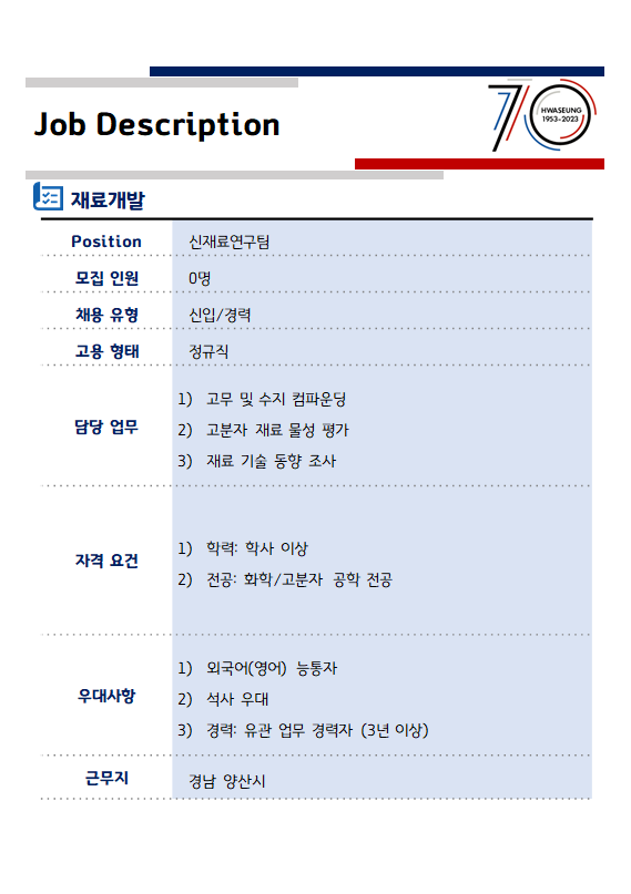 인재채용 채용공고 결과확인 [화승코퍼레이션] 재료개발 분야 신입/경력직 채용(기간연장) 채용회사 화승코퍼레이션 채용대상 신입,경력 직무 인도네시아법인 - 품질관리 채용기간 2023-07-07 ~ 2023-08-06 목록
